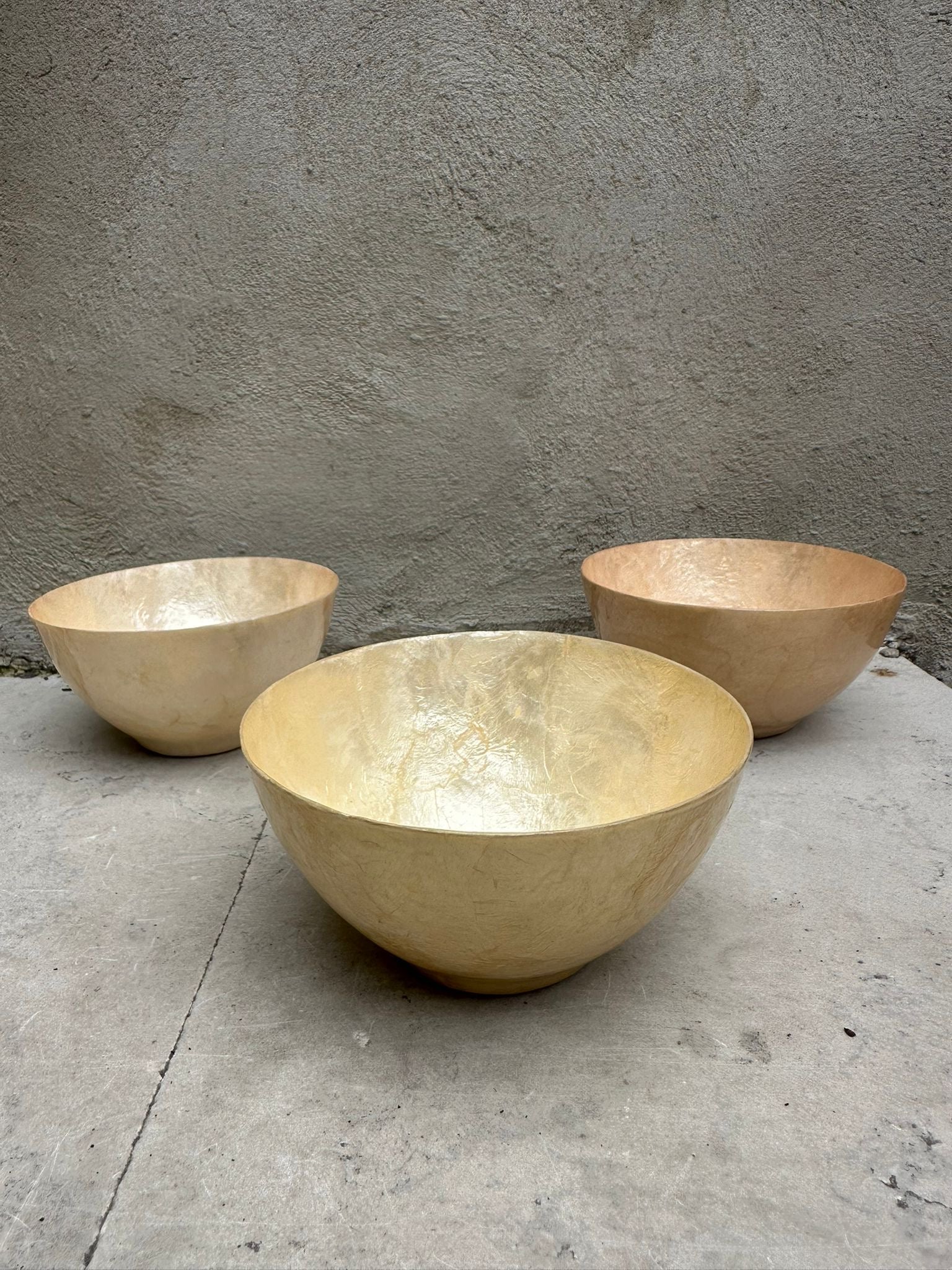 Wonderful handmade bowls made from capiz shell. Believe it or not, these are made from leftover edible shells (popular in Indonesia)! The "mother of pearl" from the shells is scraped out and washed. These fine bowls are then cast from the mass and painted in different colours. They can be used for food (just wash by hand in lukewarm water and washing-up liquid) but we think they are just as nice as decoration!